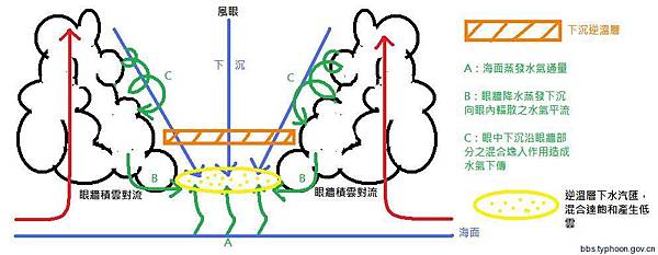 颶風眼內有助低雲生成的水汽源來源有下列三種:1.高海溫下的蒸發過程2.眼牆(雷暴積雨雲)下方降水蒸發冷卻下沉產生輻散作用向眼內推進之水汽平流3 .眼內下沉空氣於途中所攜帶的水汽進入逆溫層下方大氣(譯按:多半來自中高層眼壁,氣流順此區域下沉所致) (圖片版權及承蒙:賓州大學線上天氣預報含證教學課程)
